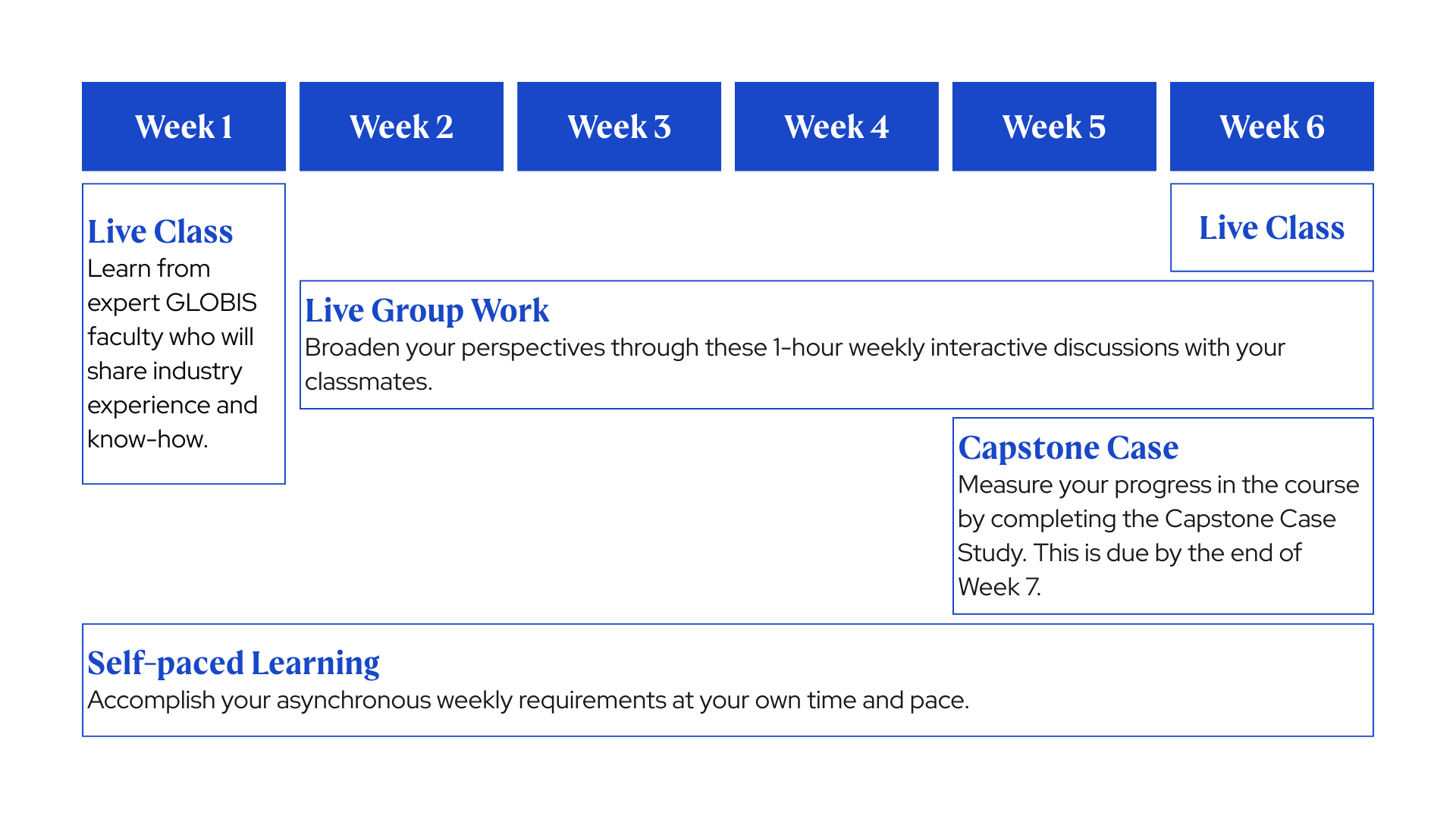 Self-paced Learning combined with 2 Live Online Classes per course held week 1 & week 6